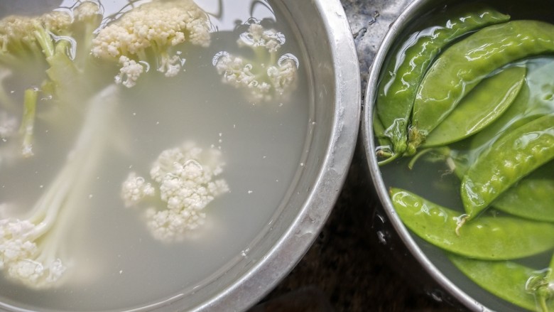 2. 花菜荷兰豆清洗干净后放淘米水浸泡十分钟左右