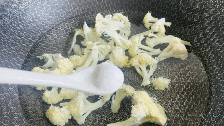 4. 锅中加入适量清水大火烧开,加入适量盐和食用油,倒入花菜焯烫片刻