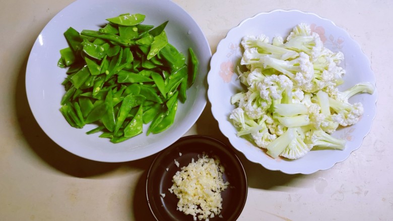 2. 荷兰豆择去两边丝络,清洗干净切段,花菜一朵朵择下来清洗干净,蒜切碎备用。