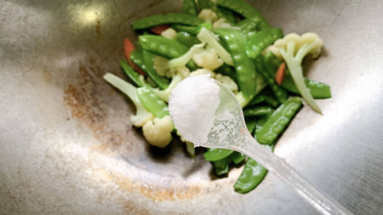 荷兰豆炒花菜,加少许盐,快炒15s出锅即可。