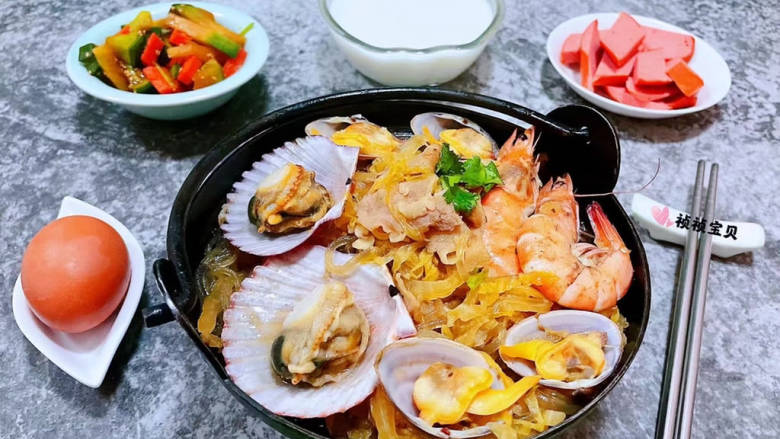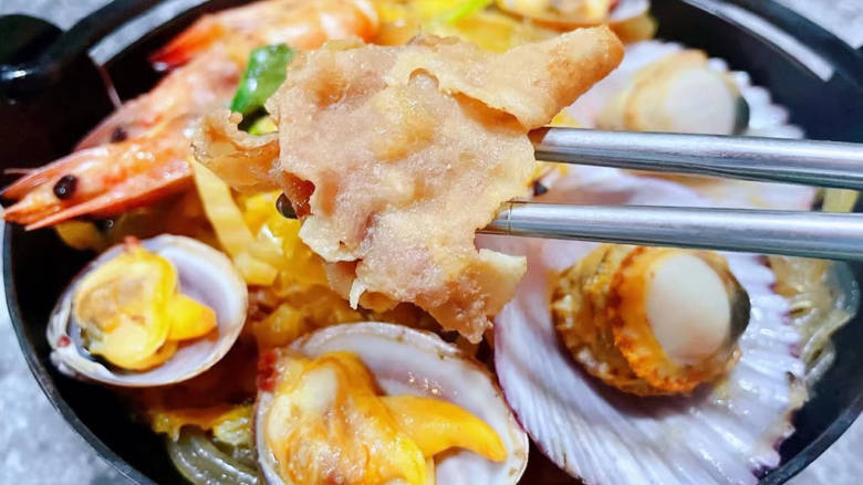 10. 放入海虾、蚬子、扇贝煮煮至开口熟透放入盐和鸡汁调味均匀
