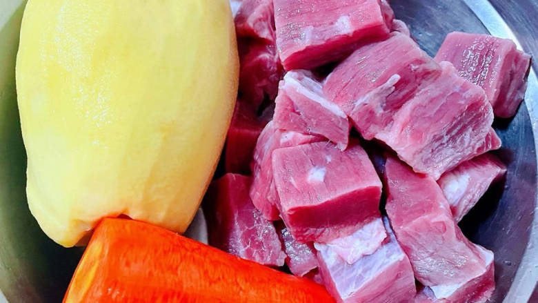 4. 土豆切成大小均匀的块状在清水中浸泡一会儿去除多余的淀粉