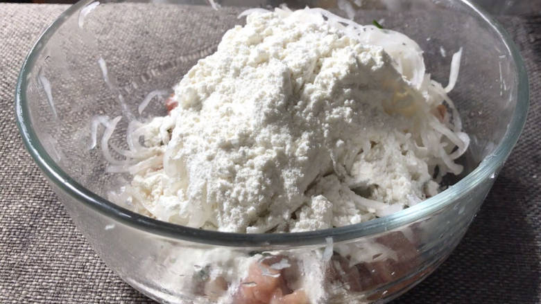 7. 将拌好的萝卜丝团成圆子,滚上面粉