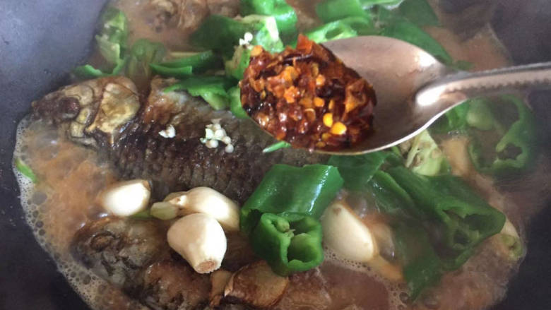 11. 来小半勺辣椒酱,盖上盖焖煮一会