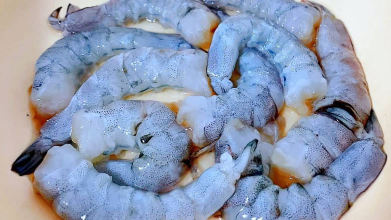 2. 新鲜的海虾去头和皮洗净沥干水份