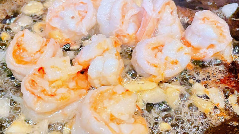 8. 放入煨制入味的海虾炒至变色