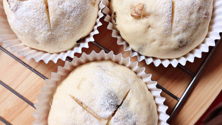 9. 分成8个小面团,放入葡萄干、核桃仁揉圆,放入纸托中进行发酵。