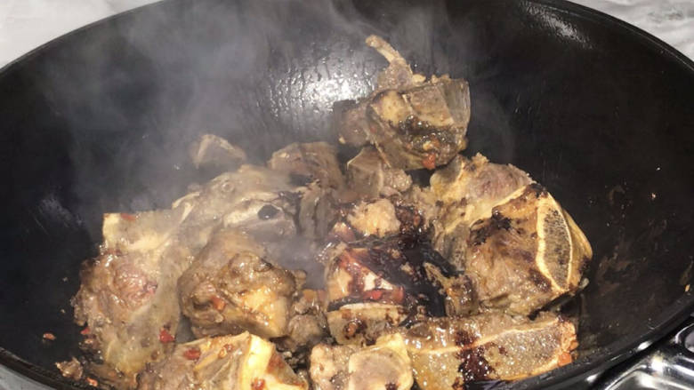 4. 牛脊骨放入热油锅中,煸炒至干水