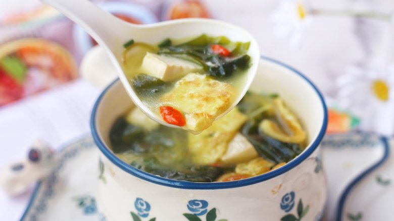 2. 豆腐切块,裙带菜洗净。葱蒜切末。