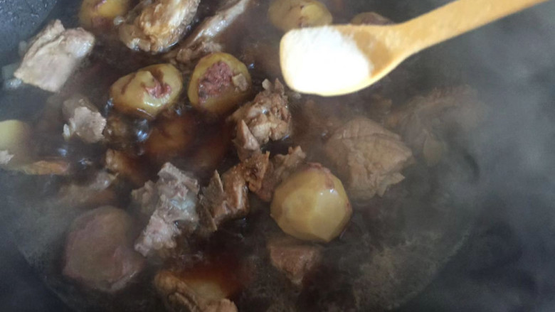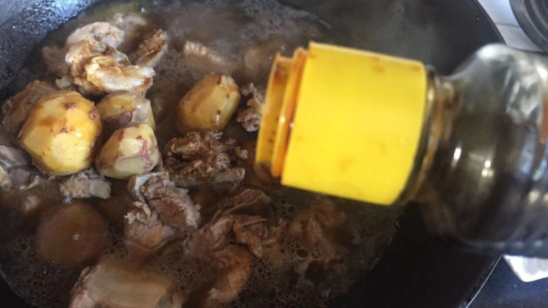 8. 压好的排骨连汤汁一起倒入炒锅中,下入板栗