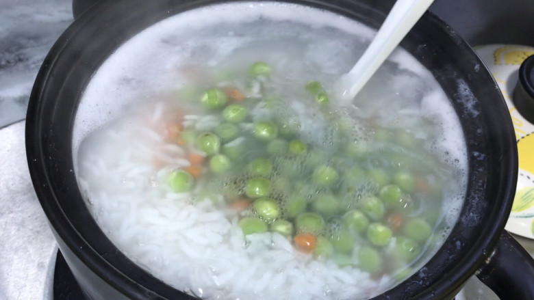 5. 约半小时后,大米熟烂,加入豌豆和胡萝卜,拌匀煮沸,继续煮至熟烂