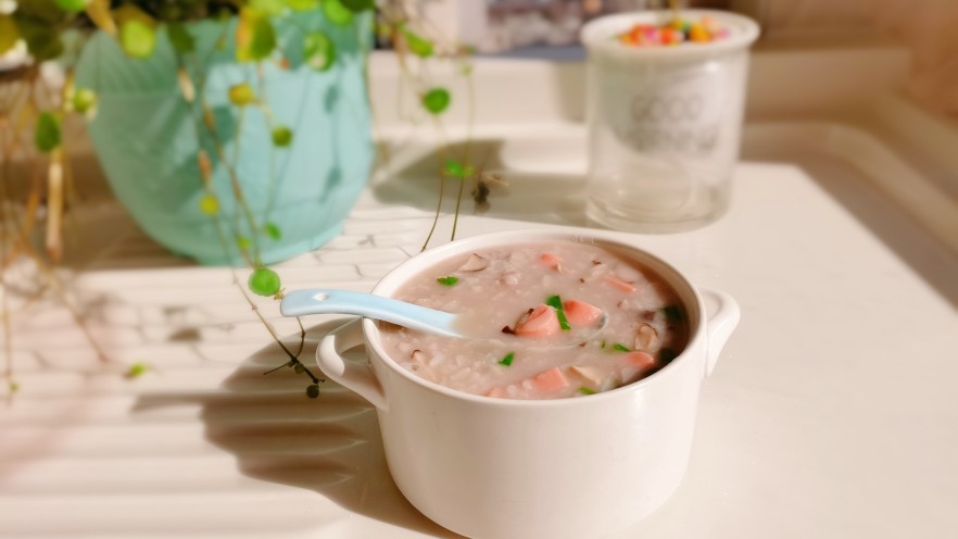 10. 大米按煮粥键把它煮开后放入香菇