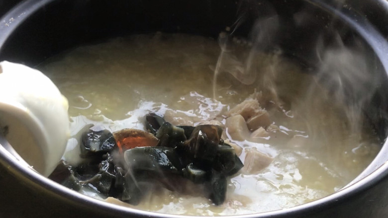 7. 约20分钟后,小米煮熟烂,汤汁也浓稠了,放入冻豆腐和皮蛋,拌匀煮沸
