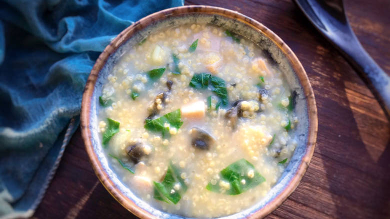 随着老爷子一起吃粥,最近肠胃不适,就做点小米粥养养胃,好久没下雨了,天气干燥,我就用小白菜和皮蛋放入小米粥里,老爷子说这样很好哦!