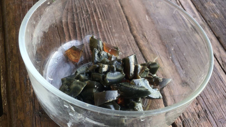 5. 皮蛋剥去外壳,洗净后切丁备用