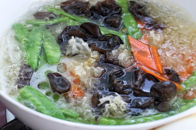 4. 接着放入木耳和银耳继续焯烫三十秒捞出。
