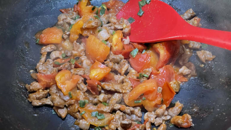 8. 小火炒至番茄变软出汁。倒入牛肉。