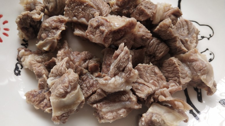 4. 牛肉泡好后,放锅里焯水,烧开后再烧2分钟左右,捞出洗净沥干水分备用