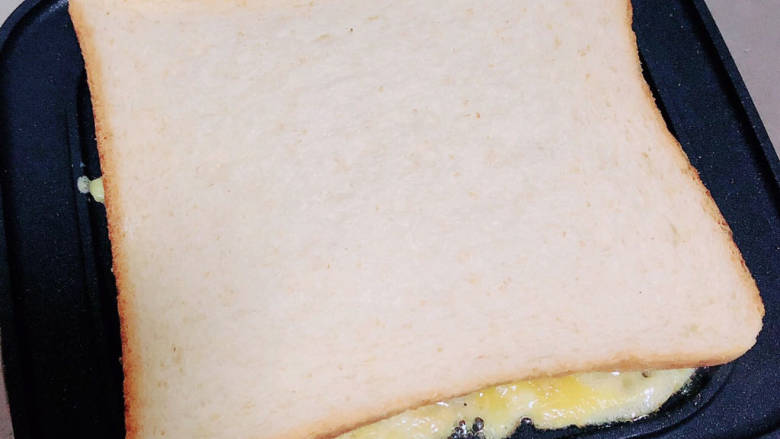 10. 再盖上一片切片面包,盖上煎锅的盖子,小火煎2-3分钟。芝士碎融化,即可开盖儿,三明治就做好了。