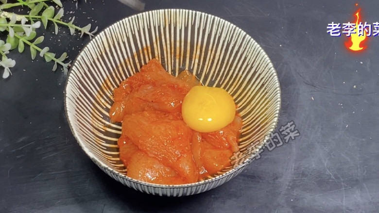 1. 腌制好的鸡肉中加一个蛋黄抓拌均匀。