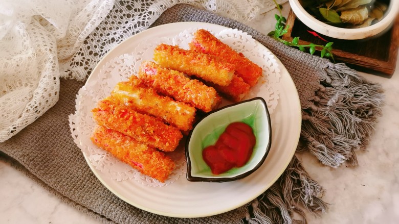 7. 起油锅放入食用油,加热至6层热,放入蟹柳炸制。
