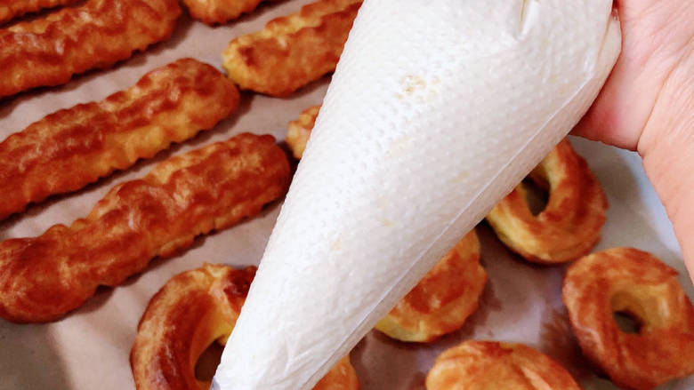 9. 将面糊装入已放在杯中的挤花袋中(闪电泡芙可挑选锯齿状的花嘴。