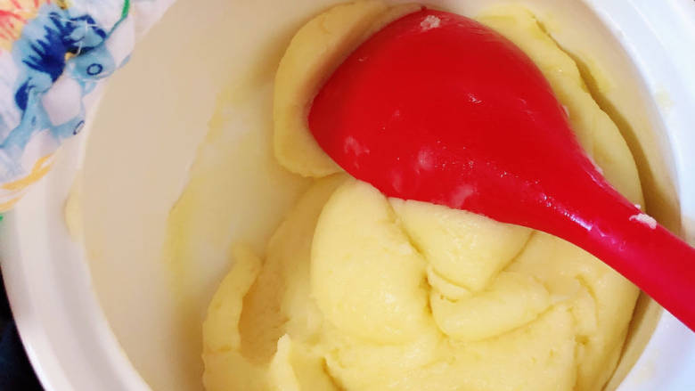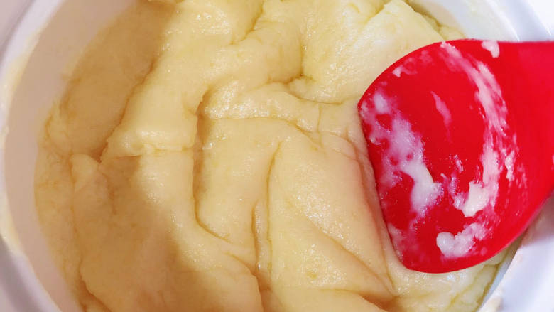 7. 将面略放凉至65度以下,趁面团微热时,将蛋液分2-3次倒入,使蛋液完全被吸收后才再加下一次的蛋液。