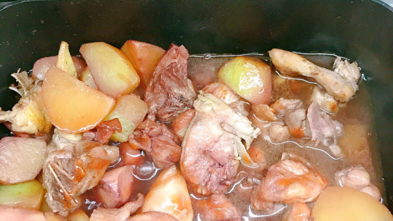 16. 再加入200毫升红酒烧开,盖上锅盖焖30分钟