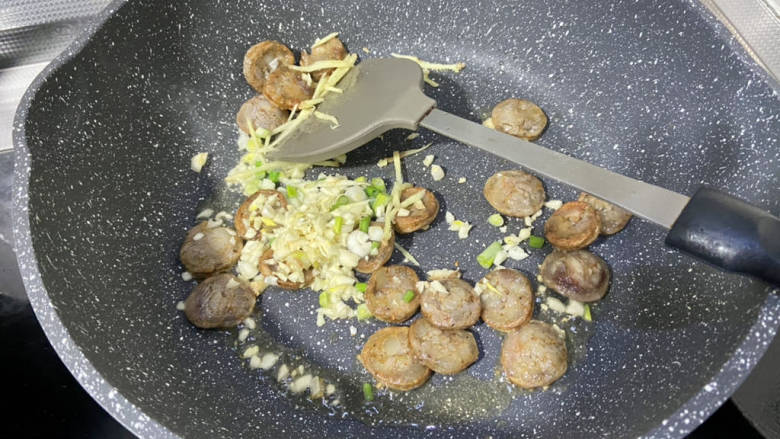 6. 热锅冷油下腊肠中小火煸炒出油,下姜丝葱白蒜末炒香