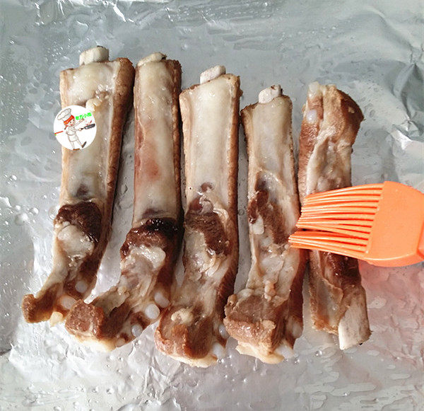 8. 烤盘铺张锡纸,表面刷食用油,放上排骨后再刷一层蜂蜜水