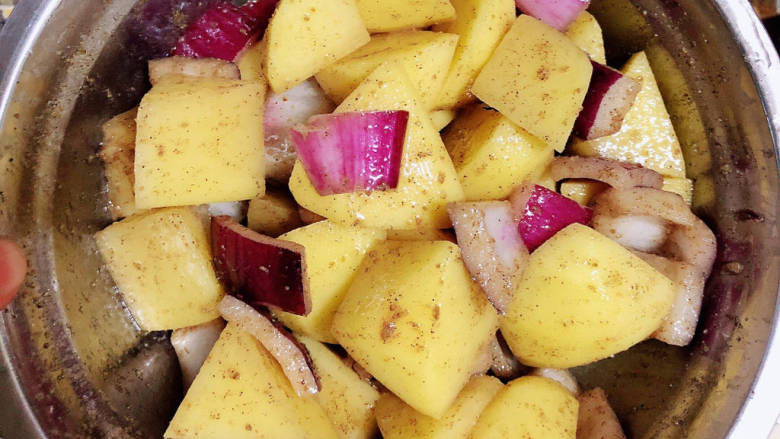 9. 摆放土豆、洋葱,放入烤箱,200度烤20分钟。