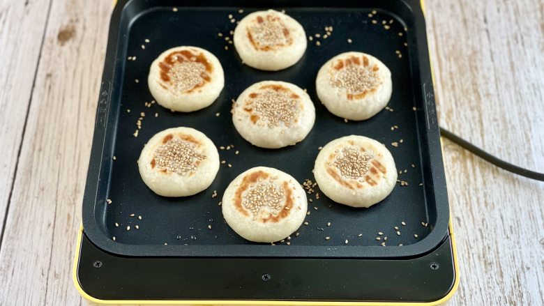 15. 把饼胚放入电饼铛,饼面粘上白芝麻;