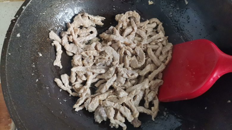 10. 起锅烧油,多倒一点油,把肉丝滑熟盛出备用