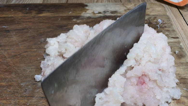 2. 鱼肉用刀平压检查鱼刺,再用刀背剁肉成蓉,至出胶