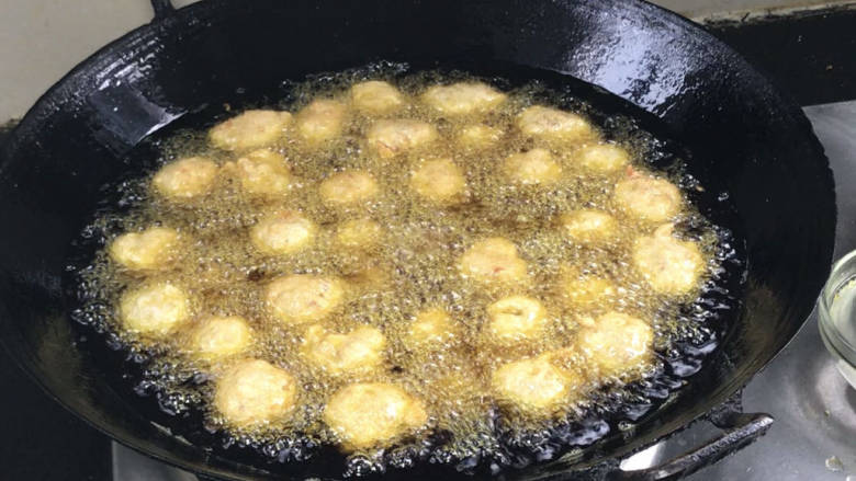 11. 放七成热的油锅中,挤丸子的时候将火打至中火,一次挤一锅丸子,用锅铲背部轻轻推搬均匀
