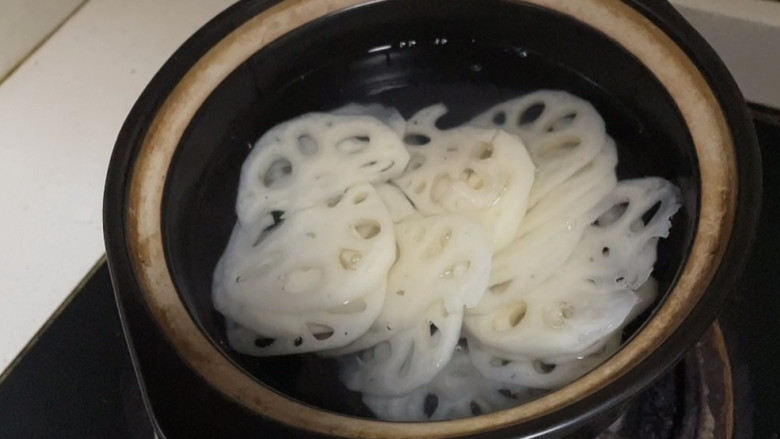 2. 锅中倒入适量清水煮沸后加入莲藕焯2分钟捞起