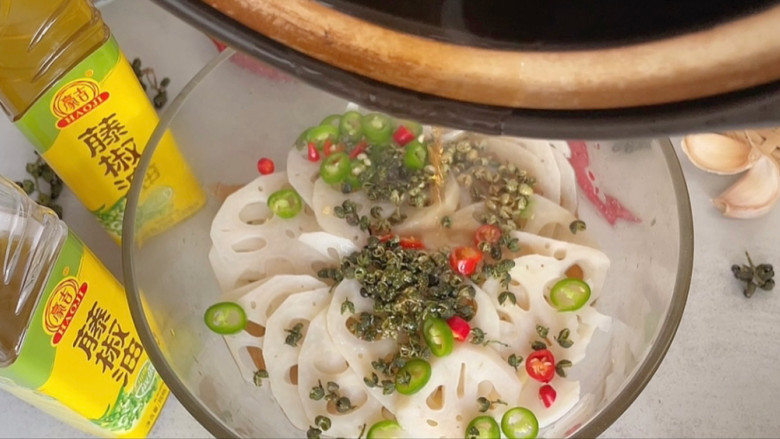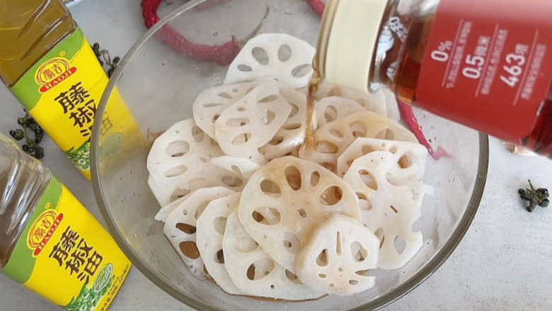 - 莲藕建议切的薄一点,焯1分钟即可捞出,不建议焯太久,不然影响口感,既然是椒麻口感那藤椒油就必不可少了