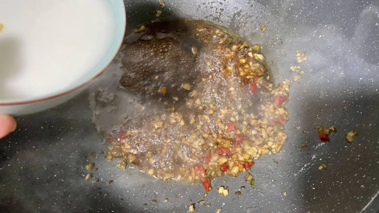 14. 转中火,淋入两汤匙水淀粉收汁到浓郁