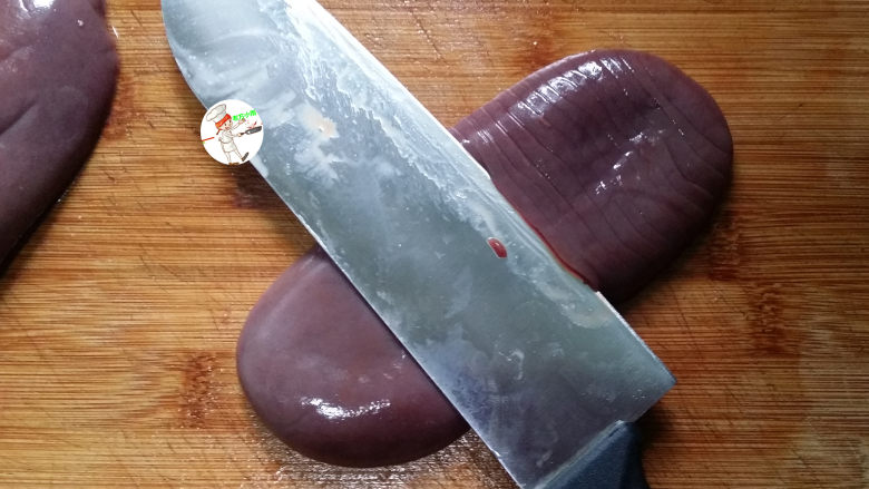 6. 猪腰处理好后,抹平切十字花刀:先用刀45度斜刀切下去、刀口深至4/5,但不要切断