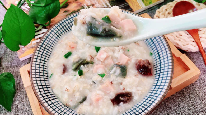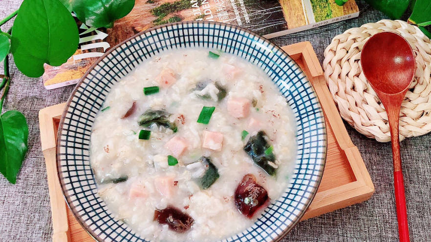 10. 鲜香美味的皮蛋火腿粥就上桌了。