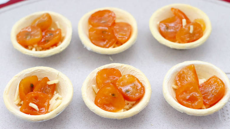 3. 蛋挞皮先铺上一层芝士碎。
