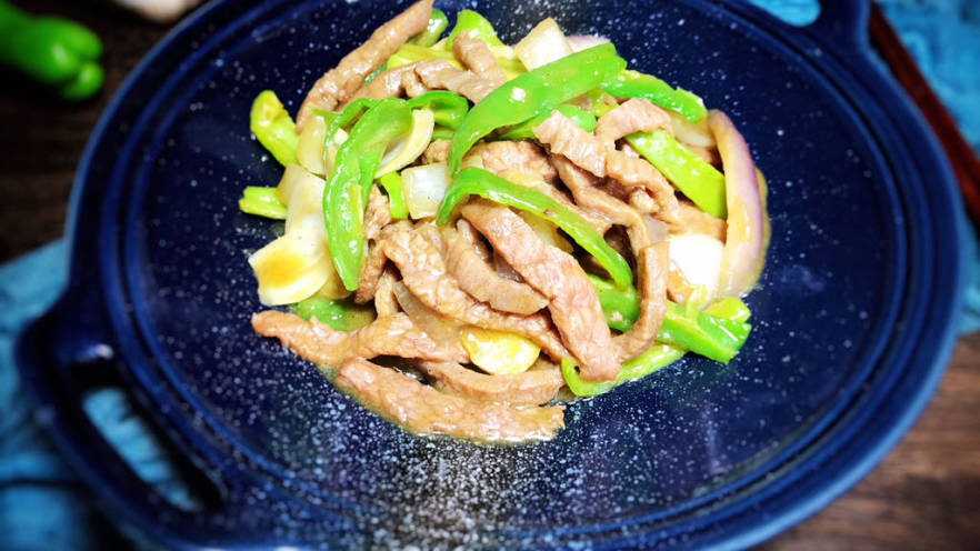 8. 放入青椒和洋葱炒匀,加盐和胡椒粉炒匀至断生