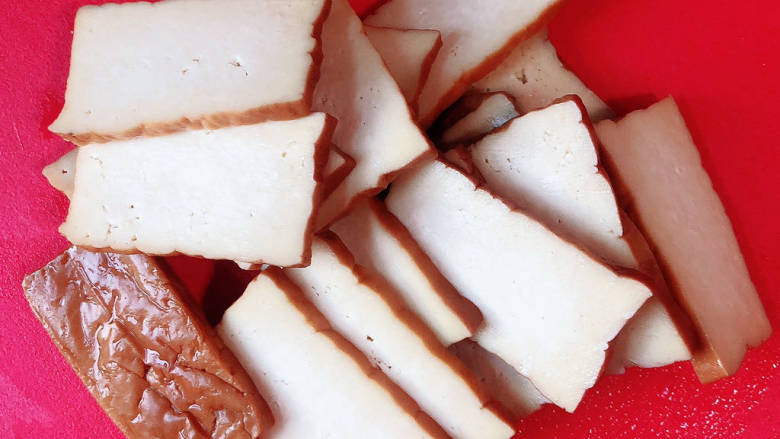 2. 准备些豆干,切片备用。
