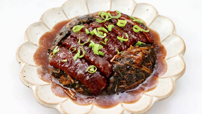 17. 淋上勾好芡的汤汁,撒上少许葱花,梅菜扣肉完成,用家乐桂花红烧酱,事半功倍味道好,而且风味独特又做法简单,你学会了吗!