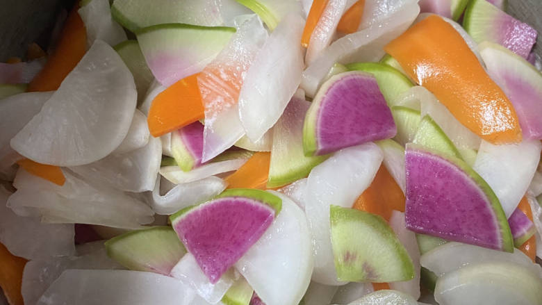 1. 3样萝卜按自己切成自己喜欢的形状,吃久点就切厚点。