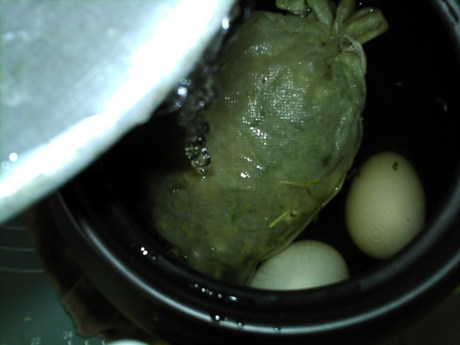 3. 将药袋同浸泡水一起放入砂煲,加入鸡蛋。