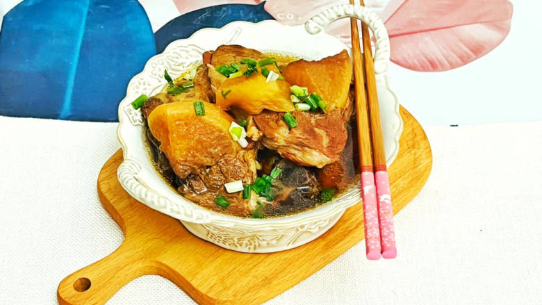 14. 美味的萝卜煲羊排就做好了,撒上葱花装饰一下吧