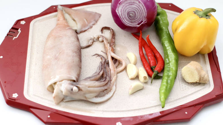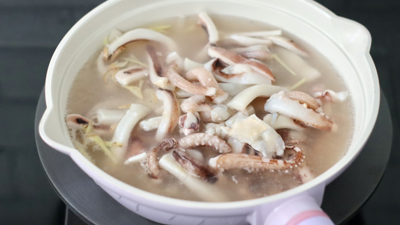5. 大火烧开后,放入鱿鱼开始绰水。