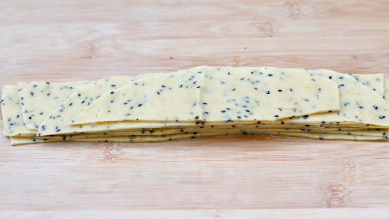 15. 把4指宽面片对折后切成14~16股,展开后平铺,左上角对右下角按紧,然后右上角也与右下角右侧部分重合按紧,左下角与右下角按紧,稍微整理就和扇子一样了。