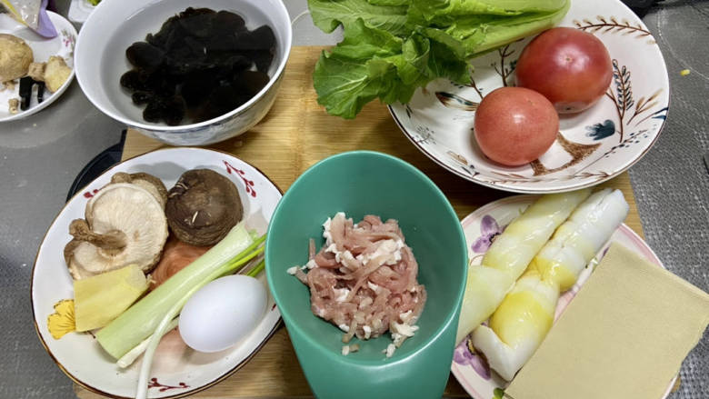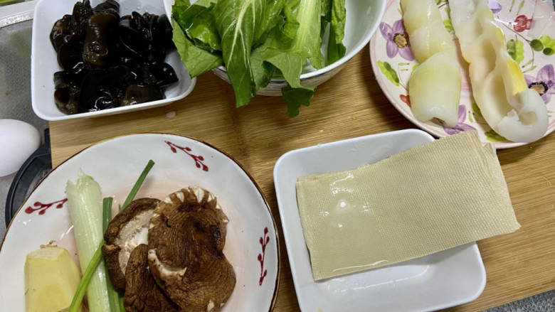4. 木耳搓洗干净,香菇去蒂洗净,葱姜洗净,豆皮洗净,小白菜择好洗净,笋洗净